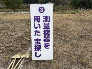 測量機器を使って、フィールド内に隠された‘‘宝’’を探すゲーム形式の体験を行いました。子どもたちは、端末に表示された宝のありかを真剣な表情で探していました!
